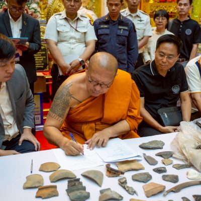 พ่อค้า แม่ค้าขายงานวัดไร่ขิง สุดปลื้ม ผู้ช่วยเจ้าอาวาสวัดไร่ขิง เดินแจกผ้ายันต์และวัตถุมงคลที่ระลึก งานประจำปีวันสุดท้าย
