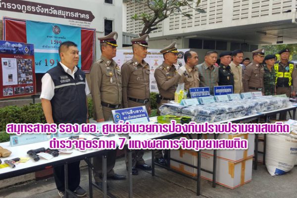 เมื่อเวลา 10.44 น.วันที่ 6 ธันวาคม 2561 ที่ผ่านมา ที่ชั้นล่าง อาคารกองบังคับการ ตำรวจภูธรจังหวัด สมุทรสาคร พล.ต.ต.สุรพงษ์ ชัยจันทร์ รองผู้บัญชาการตำรวจภูธรภาค 7 (รองผู้อำนวยการ ศูนย์อำนวยการป้องกันปราบปรามยาเสพติดตำรวจภูธรภาค 7) ผู้ว่าราชการจังหวัดสมุทรสาคร ผู้บังคับการตำรวจภูธรจังหวัดสมุทรสาคร รองผู้บังคับการตำรวจภูธรจังหวัดสมุทรสาคร (ปส.) ผู้กำกับการสืบสวน ตำรวจภูธรจังหวัดสมุทรสาคร ผู้กำกับการสถานีตำรวจภูธรเมืองสมุทรสาคร พ.ต.อ.ปรีดา อิ่มเจริญ รอง ผบก.ภ.จว.นครปฐม (สส.ปส.) พร้อมหัวหน้าสถานี และชุดจับกุม สังกัดตำรวจภูธรจังหวัดนครปฐม สังกัดตำรวจภูธรจังหวัดสมุทรสาคร ร่วมกันนำของกลาง ยาเสพติด ของกลางทรัพย์สิน ที่ยึดได้จากขบวนการผู้ค้ายาเสพติดซึ่งเชื่อได้ว่าเป็นทรัพย์สินที่ได้มาจากการค้ายาเสพติด มาแถลงผลงานการจับกุม ต่อสื่อมวลชน