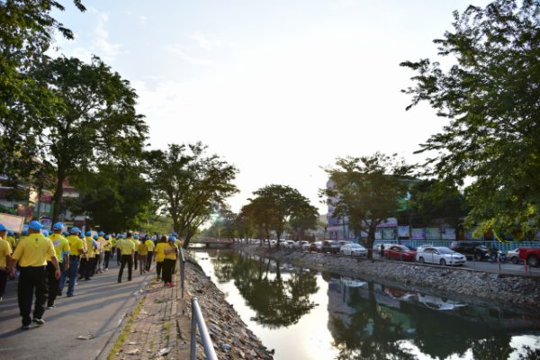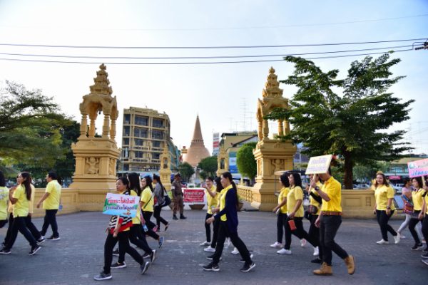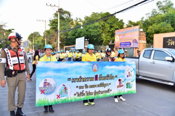 จากนั้น ผู้ว่าราชการจังหวัดนครปฐม นำกล่าวคำปฏิญาณตน เราทำความดีด้วยหัวใจ รวมทั้งมอบแผ่นป้าย “ไม่ทิ้ง ไม่เท ทุ่มทำความดี” ให้แก่ผู้ว่าราชการจังหวัดนครปฐม เพื่อนำคณะส่วนราชการ จิตอาสา และประชาชน กว่า 500 คน เดินรณรงค์จากวัดพระงาม พระอารามหลวง ไปตามเส้นทางเลียบคลองเจดีย์บูชา และเข้าสู่ถนนพิพิธปราสาท ไปยังวัดห้วยจระเข้ เพื่อเป็นการบำเพ็ญสาธารณประโยชน์และสร้างจิตสำนึกในการดูแล รักษา พัฒนาคลอง เพื่อคุณภาพชีวิตที่ดีของผู้อยู่อาศัยตามแนวคลองเจดีย์บูชา และการรักษาสิ่งแวดล้อมที่ดีให้แก่ชุมชนริมน้ำ เพื่ออุทิศถวายพระราชกุศลแด่พระบาทสมเด็จพระปรมินทรมหาภูมิพลอดุลยเดช บรมนาถบพิตร และสืบสานพระราชปณิธานอันแน่วแน่ ที่พระองค์ทรงมีพระราชปรารถนาให้ชุมชนริมน้ำมีวิถีการดำเนินชีวิตอย่างมีความสุขอย่างยั่งยืนสืบไป