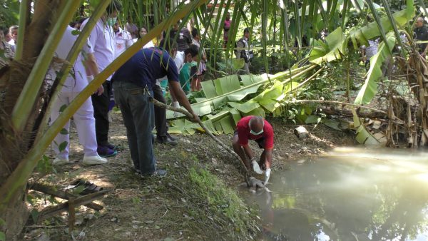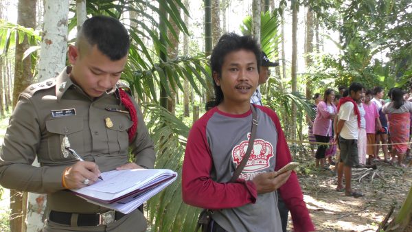 ทั้งนี้ นายสิทธิชัย อนุศรี อายุ 32 ปี ชาว จ.อุทัยธานี โดยมาทำงานเป็นลูกจ้างที่ร้านธุรกิจก่อสร้างแห่งหนึ่งใน อ.นาโยง เป็นคนพบศพคนแรก ขณะพักเที่ยงจากงานแล้วขับรถจยย.มาหาเห็ดโคนในบริเวณใกล้กับสระน้ำดังกล่าว เพราะเคยมาหาบ่อยครั้ง จึงพบศพ ตอนแรกเข้าใจว่าเป็นตุ๊กตา แต่พอตรวจสอบแล้วพบว่าเป็นศพเด็ก จึงแจ้งเจ้าหน้าที่ตำรวจ ทางด้านชาวบ้านใกล้จุดพบศพ กล่าวว่า ในบริเวณใกล้เคียงไม่มีหญิงวัยรุ่นหรือใครตั้งครรภ์ เชื่อว่าน่าจะเป็นหญิงสาวที่ตั้งครรภ์ไม่พร้อม และทำคลอดเอง จากนั้นนำร่างเด็กมาทิ้ง จนกลายเป็นศพดังกล่าว ซึ่งเจ้าหน้าที่จะได้ติดตามสืบสวนไปยังโรงพยาบาลส่งเสริมสุขภาพประจำตำบลใกล้เคียง รวมทั้งโรงพยาบาลต่างๆ เพื่อติดตามแม่ใจยักษ์ต่อไป เพราะเชื่อว่าผู้เป็นแม่จะต้องตกเลือดต้องเข้ารับการรักษาในโรงพยาบาล จากนั้นเจ้าหน้าที่ได้นำศพทารกไปเก็บไว้ที่ รพ.นาโยงเพื่อนำส่งไปผ่าพิสูจน์ที่โรงพยาบาลสงขลานครินทร์ จ.สงขลา เพื่อเก็บดีเอ็นเอ และตรวจหาสาเหตุการตายที่แท้จริงต่อไป