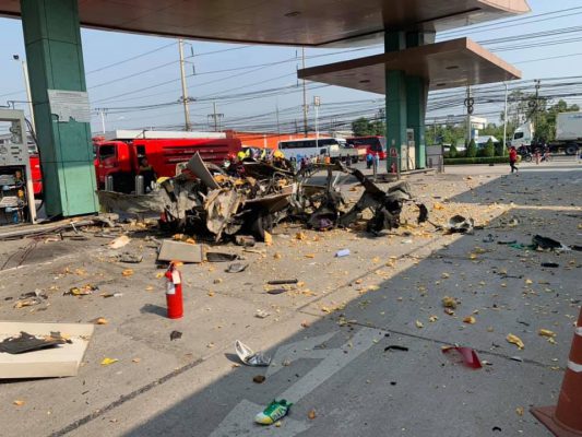 ที่เกิดเหตุ เป็นปั๊ม แก๊ส NGV ของบริษัท รอยัลโกลเด้นดรากอน มีพื้นที่ ประมาณ 2 ไร่ ที่บริเวณตู้จ่ายก๊าซตู้ที่ 2 พบรถยนต์แท็กซี่ยี่ห้อ โตโยต้า อัลตีส สีเหลือง ทะเบียน ทว-8142 กรุงเทพมหานคร ถูกแรงอัดระเบิดของถังบรรจุก๊าซพังยับเยินแหลกทั้งคัน และที่บริเวณตู้จ่ายก๊าซดังกล่าวถูกแรงอัดจะฝาข้างตูจ่ายก๊าซกระเด็นหายไป ในที่เกิดเหตุพบเพียงกองเลือดส่วนผู้บาดเจ็บทราบว่ามี 3 รายเป็นคนขับแท็กซี่ 1 รายและหญิงพนักงานของปั้มดังกล่าว 2 ราย เจ้าหน้าที่มูลนิธิได้นำส่งรักษาที่โรงพยาบาลบางนา 2 ก่อนแล้ว ในที่เกิดยังพบว่ามีรถแท็กซี่ที่ถูกแรงระเบิดเสียหายอีก 1 คัน เป็นแท็กซี่สีเขียวเหลือง ทะเบียน 1 มก 8529 กรุงเทพมหานคร ถูกแรงระเบิดจนกระจกประตูข้างซ้ายแตกทั้ง 2 บาน