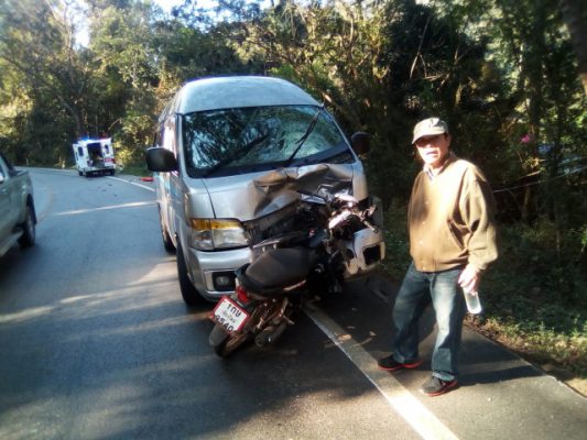 โดยนายไพทูรย์ บุญทาวงค์ ผู้ขับรถตู้และผู้ที่โดยสารรถตู้หมายเลขทะเบียน นค 4856 เชียงใหม่ และรถจักรยานยนต์เวฟสีแดง หมายเลขทะเบียน 1 กษ 9540 เชียงใหม่ ซึ่งขับแหกโค้งมาชนหน้ารถตู้ อย่างแรง และตัวเองกระเดนไปตกข้างทางเสียชีวิตในที่เกิดเหตุทันที ซึ่งทราบจากนายไพทูรย์ บุญทาวงค์ ผู้ขับรถตู้ ว่าตนเองได้ขับรถมาจากทางเชียงใหม่และจะไปทำบุญกันที่อำเภอแม่อาย จังหวัดเชียงใหม่ เมื่อมาถึงที่เกิดเหตุได้เห็นรถมอเตอไชค์ขับมาย่างรวดเร็วและเสียหลักแหกโค้งเข้ามาชนตนเองในเส้นทางวิ่งของตนเอง และเสียชีวิต ทางเจ้าหน้าที่ได้บันทึกและจะเรียกมาทำการดำเนินคดีตามกฏหมายต่อไป