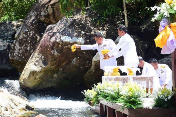 จากนั้นนายก่อพงษ์ โกมลรัตน์ รองผู้ว่าราชการจังหวัดนราธิวาส ประธานในพิธีพลีกรรมตักน้ำจากแหล่งน้ำศักดิ์สิทธิ์ได้ประกอบพิธีพลีกรรมตักน้ำ กล่าวคาถาบริกรรมตักน้ำ แล้วตักน้ำจากบ่อน้ำศักดิ์สิทธิ์ ณ บ่อน้ำคลองน้ำแบ่ง บริเวณเขตรักษาพันธุ์สัตว์ป่าเฉลิมพระเกียรติสมเด็จพระเทพรัตน์์ราชสุดาฯสยามบรมราชกุมารี บ้านกูจำ หมู่ที่ ๓ ตำบลไพรวัน อำเภอตากใบ จังหวัดนราธิวาส ซึ่งเป็นแหล่งน้ำสำคัญของจังหวัดแหล่งที่ 1 โดยลำน้ำคลองน้ำแบ่ง ต.ไพรวัน อ.ตากใบ จ.นราธิวาส นั้นมีความศักดิ์สิทธิ์ ซึ่งเป็นคลองน้ำสีดำไหลมาบรรจบกัน 4 สาย 4 อำเภอ ได้แก่ อ.สุไหงปาดี อ.ตากใบ อ.ระแงะ และ อ.เมืองนราธิวาส ซึ่งชาวนราธิวาส ได้ใช้อาศัยดื่มกิน และใช้ประโยชน์จากลำน้ำดังกล่าวมาอย่างยาวนาน