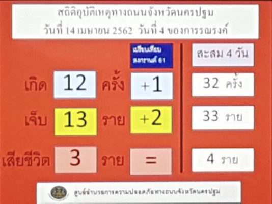 สำหรับผลการปฏิบัติงานป้องกันและลดอุบัติเหตุทางถนน ช่วงเทศกาลสงกรานต์ 2562 จังหวัดนครปฐม นายศุภชัย แสนยุติธรรม หัวหน้าสำนักงานป้องกันและบรรเทาสาธารณภัยจังหวัดนครปฐม รายงานข้อมูลสถานการณ์ พร้อมนี้มีผู้แทนจากหน่วยงานภาคีหลักด้านความปลอดภัยทางถนนในระดับจังหวัด เข้าร่วมให้ข้อมูลในการประชุมครั้งนี้ด้วย
