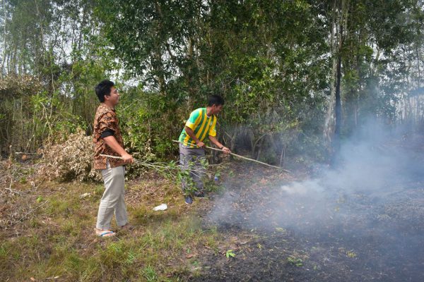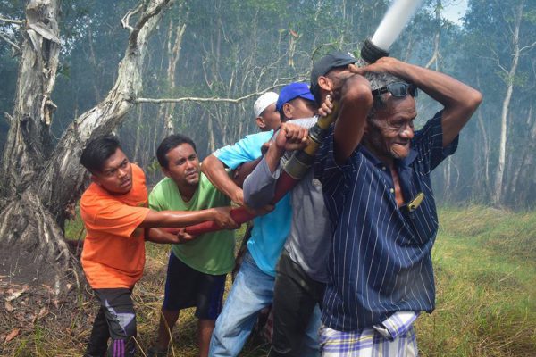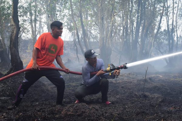 เนื่องจาก การสัญจรบนถนนไม่สามารถมองเห็นได้ทาง เทศบาลตำบลกะลุวอเหนือ ได้นำรถดับเพลิง 2 คัน ของศูนย์พิกุลทองฯ 1 คัน ออกมาฉีดน้ำ และผู้ใหญ่บ้านได้นำ ผู้ช่วยผู้ใหญ่บ้าน ชาวบ้านเพื่อดับไฟ และใช้เวลากว่า 2 ชั่วโมง จึงควบคุมไฟให้อยู่ในวงจำกัดได้ โดยมีพื้นที่ป่าเสม็ดถูกไฟไหม้เสียหายไปกว่า 20 ไร่ แต่ยังคงต้องฉีดน้ำเลี้ยงตลอดเวลาเนื่องจากยังมีกลุ่มควันพวยพุ่งตลอดเวลา และเสี่ยงที่จะเกิดไฟลุกไหม้ เนื่องจากสภาพอากาศที่ร้อนและลมกระโชกแรง