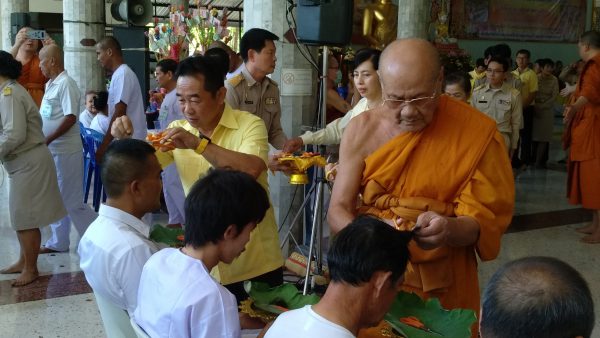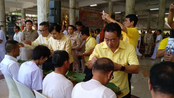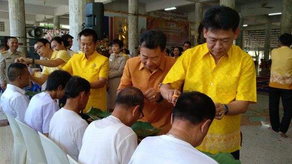 ผู้ว่าราชการจังหวัดสุพรรณบุรี นำหัวหน้าส่วนราชการและเจ้าภาพ ปลงผมนาค ผู้เข้าร่วมโครงการบรรพชาอุปสมบทเฉลิมพระเกียรติ สมเด็จพระเจ้าอยู่หัวมหาวชิราลงกรณบดินทรเทพยวรางกูร เนื่องในโอกาสมหามงคลพระราชพิธีบรมราชาภิเษก