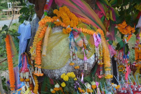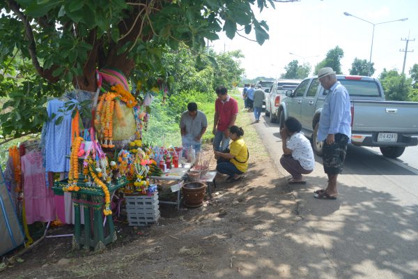 ที่ริมถนนสาย 323 ช่วงกาญจนบุรี – ไทรโยค หลักกิโลเมตรที่ 75 – 76 ตำบลหนองบัว อำเภอเมือง จังหวัดกาญจนบุรี ชาวบ้านพากันเอาดอกไม้ธูปเทียน ไปเซ่นไหว้ ขอโชคลาภกันที่ต้นยอป่า ที่ยืนต้นตระหง่านอยู่ริมถนน สูงประมาณ 20 เมตร แผ่กิ่งก้านสาขาปกคลุมไปทั่วบริเวณ ทั้งนี้ชาวบ้านเชื่อว่าการขอโชคลาภเสี่ยงทายเคยไปขอมาแล้วหลายที่หลายแห่ง แต่ครั้งนี้จะขอให้มีโชคลาภแบบไม่ให้พลาด จึงพากันมาเซ่นไหว้ขอโชคลาภกันที่ต้นยอป่า เพราะมีความเฮี้ยนสุดๆ และคงไม่ผิดหวัง