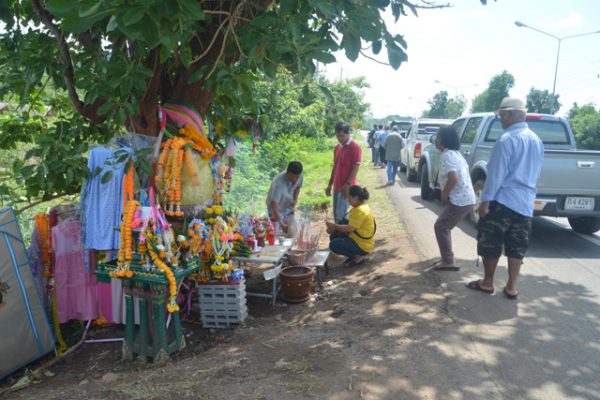 สำหรับต้นต้นยอป่าต้นนี้ เหตุที่มีคอหวยมาขอโชคขอลาภกันเนื่องจาก เมื่อประมาณ 2 ปี ที่ผ่านมาได้มีรถยนต์ ชนผู้หญิงท้องแก่ ไปติดกับต้นยอป่าต้นนี้ และเสียชีวิตคาที่ ทั้งแม่และลูก (โบราณเรียกว่าตายทั้งกลม) ต่อมา ผู้ที่ขับรถผ่านบริเวณนี้ มีคนเห็นผู้หญิงและเด็กยืนโบกรถเป็นประจำ ต่อมาจึงมีคนมาจุดธูปขอโชคลาถ ปรากฏว่าได้เลขตามที่บอกไว้ เมื่อเรื่องนี้มีการพูดกันปากต่อปาก ทำให้ชาวบ้านทั้งใกล้ลำกล เดินทางมาขอหวย เป็นจำนวนมาก โดยเฉพาะก่อนหวยออก 1 วัน เวลากลางคืน จะมีคนมาขอหวยเป็นจำนวนมาก
