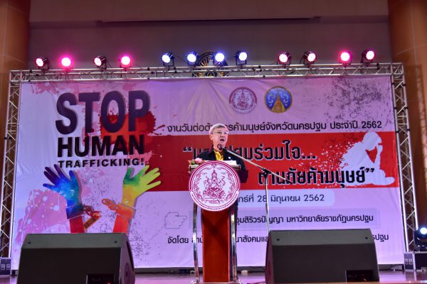 วันที่ 28 มิถุนายน 2562 ที่อาคารสิริวรปัญญา มหาวิทยาลัยราชภัฏนครปฐม นายชาญนะ เอี่ยมแสง ผู้ว่าราชการจังหวัดนครปฐม เป็นประธานเปิดกิจกรรมวันต่อต้านการค้ามนุษย์จังหวัดนครปฐม 2562 นำกล่าวประกาศเจตนารมณ์การต่อต้านการค้ามนุษย์ และมอบเกียรติบัตรแก่องค์กรที่สนับสนุนการดำเนินงานการป้องกันและปราบปรามการค้ามนุษย์จังหวัดนครปฐม โดยนายอุทิศ บุญช่วย พัฒนาสังคมและความมั่นคงของมนุษย์จังหวัดนครปฐม กล่าวว่า วันที่ 5 มิถุนายนของทุกปี เป็นวันรณรงค์ต่อต้านการค้ามนุษย์” โดยกระทรวงการพัฒนาสังคมและความมั่นคงของมนุษย์เป็นหน่วยประสานงานหลักในการดำเนินงานป้องกันและปราบปรามการค้ามนุษย์ ได้จัดงานวันต่อต้านการค้ามนุษย์ในส่วนกลางอย่างต่อเนื่องเป็นประจำทุกปี และตระหนักถึงความสำคัญในการป้องกันปัญหาการค้ามนุษย์ในระดับพื้นที่ ทำงานเชิงรุกครอบคลุมทุกพื้นที่และทุกกลุ่มเป้าหมาย ตลอดจนให้หน่วยงานภาครัฐ ภาคเอกชน ภาคประชาสังคม ที่ดำเนินงานด้านการป้องกันและปราบปรามการค้ามนุษย์ในจังหวัดนครปฐม รวมพลังแสดงถึงเจตนารมณ์ ความมุ่งมั่น และรณรงค์ เผยแพร่การดำเนินงานด้านการป้องกันและปราบปรามการค้ามนุษย์ของประเทศไทยและจังหวัดนครปฐม เพื่อให้ ประชาชนและทุกภาคส่วนได้รับความรู้และตระหนักถึงภัยอันตรายปัญหาการค้ามนุษย์ และมีส่วนช่วยในการเฝ้า ระวังปัญหาการค้ามนุษย์ในชุมชน