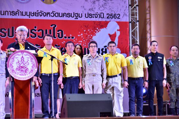 จังหวัดนครปฐม จัดงานวันต่อต้านการค้ามนุษย์ ประจำปี 2562 “นครปฐมร่วมใจ ต้านภัยค้ามนุษย์” เพื่อให้หน่วยงานทุกภาคส่วนที่ดำเนินงานด้านการป้องกันและปราบปรามการค้ามนุษย์ รวมพลังแสดงถึงเจตนารมณ์ ความมุ่งมั่น ตระหนักถึงภัยอันตรายปัญหาการค้ามนุษย์ และมีส่วนช่วยในการเฝ้า ระวังปัญหาการค้ามนุษย์ในชุมชน