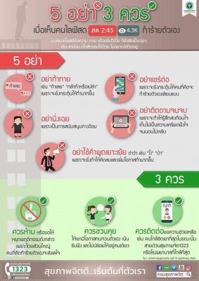 เมื่อเห็นคนไลฟ์สดหรือโพสต์ข้อความจะทำร้ายตัวเองหรือสั่งเสียเป็นนัยๆเช่นลาก่อนอโหสิกรรมให้ด้วยไม่อยากมีชีวิตอยู่อย่ามองว่าเป็นการเรียกร้องความสนใจไร้สาระหรือล้อเล่นควรช่วยเหลือทันทีโดยใช้หลัก 5 อย่า 3 ควร