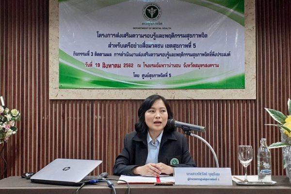นางสาวรัชวัลย์ บุญโฉม ผู้อำนวยการศูนย์สุขภาพจิตที่ 5 กล่าวว่า กรมสุขภาพจิต มีบทบาทภารกิจหลักในการส่งเสริม ป้องกัน ปัญหาสุขภาพจิตสำหรับประชาชน บำบัดรักษา รวมทั้งฟื้นฟูสมรรถภาพของผู้ป่วยจิตเวชมีการกำหนดยุทธศาสตร์ ในการสร้างความตระหนักและเข้าใจต่อปัญหาสุขภาพจิต โดยเสริมสรางความรอบรู้ และพฤติกรรมสุขภาพจิตแก่ประชาชน ซึงมุ่งเน้นให้ประชาชนมีความรอบรู้ด้านสุขภาพจิตที่มีประสิทธิภาพ สร้างและขยายเครือข่ายที่เกี่ยวข้องทั้งภาครัฐแบะเอกชน
