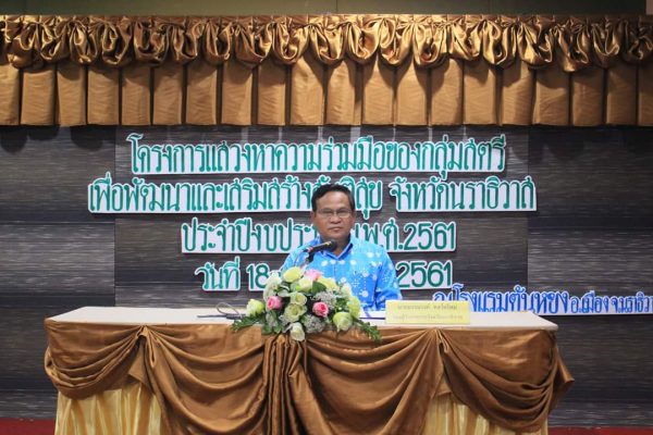 วันนี้ 19 ม.ค. 61 เวลา 11.00 น. ที่ โรงแรมตันหยง อ.เมือง จ.นราธิวาส นายธรรมรงค์ คงวัดใหม่ รองผู้ว่าราชการจังหวัดนราธิวาส เป็นประธานเปิดโครงการแสวงหาความร่วมมือของกลุ่มสตรีเพื่อพัฒนาและเสริมสร้างสันติสุข จังหวัดนราธิวาสประจำปี 2561 โดยมี พ.ต.ต.มนัส ศิกษมัต ผู้บังการตำรวจภูธรจังหวัดนราธิวาส นาวาเอกเทพประทาน เข่งเจริญ รองผู้บังคับการหน่วยเฉพาะกิจ นาวิกโยธินกองทัพเรือ นายมาหะมะยากี หะยีมะ จ่าจังหวัดนราธิวาส ตลอดจนหัวหน้าส่วนราชการ เจ้าหน้าที่ กลุ่มผู้นำสตรีของคณะกรรมการอิสลามประจำมัสยิด จาก 13 อำเภอรวมทั้งสิ้น 280 คน เข้าร่วมประชุม