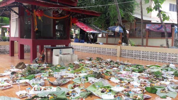 โดยชาวบ้านจะจัดสำรับอาหารคาวหวานพร้อมผลไม้ตามฤดูกาลและขนมชนิดแห้งต่างๆใส่กระจาดซึ่งสามารถเก็บไว้รับประทานได้นานๆ หรือเรียกอีกอย่างหนึ่งว่า สลากภัตร คือ การนำอาหารคาว หวาน ดังกล่าวถวายแด่ ภิกษุตามสลากที่จับได้ และยังจัดอาหารหวานคาวใส่กระทงเพื่อไหว้พระ ไหว้เจ้าที่และสัมภเวสีผีไม่มีญาติอีกด้วย