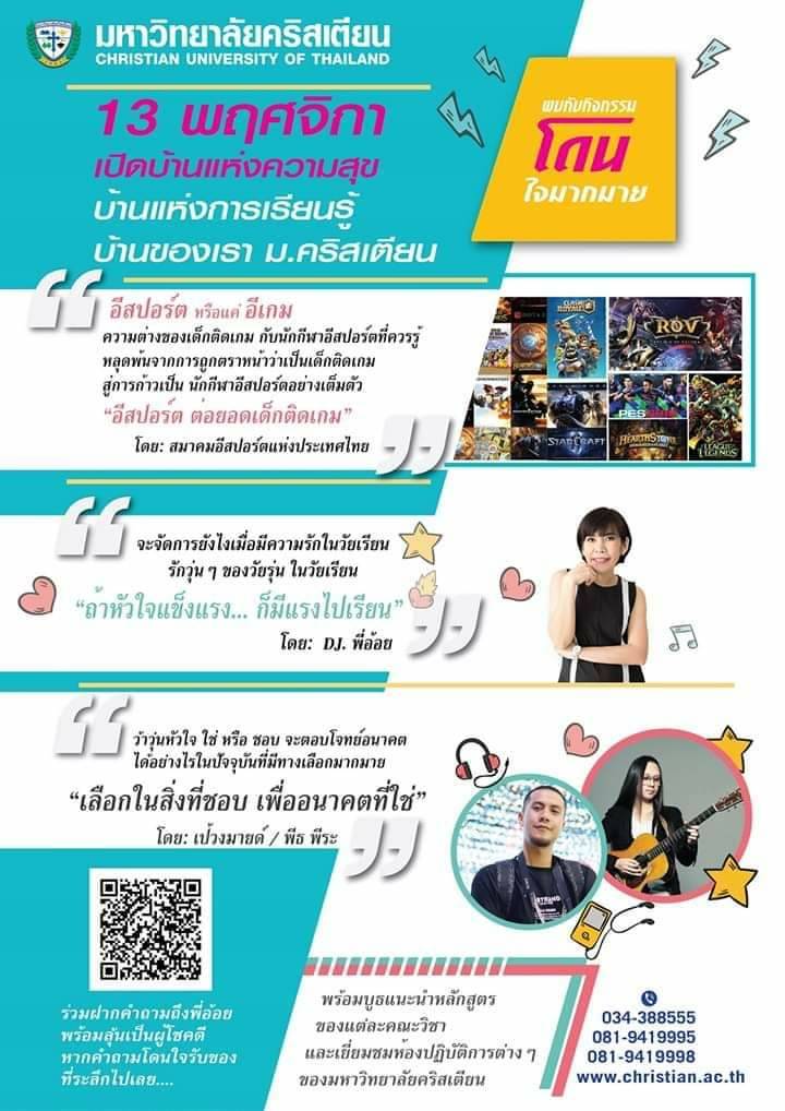 ร่วมสนุกไปกับกิจกรรมจากคณะ สาขาวิชาต่างๆ พร้อมเข้าสัมผัสห้องปฏิบัติการจริง โดยอาจารย์และรุ่นพี่ ของ ม.คริสเตียน