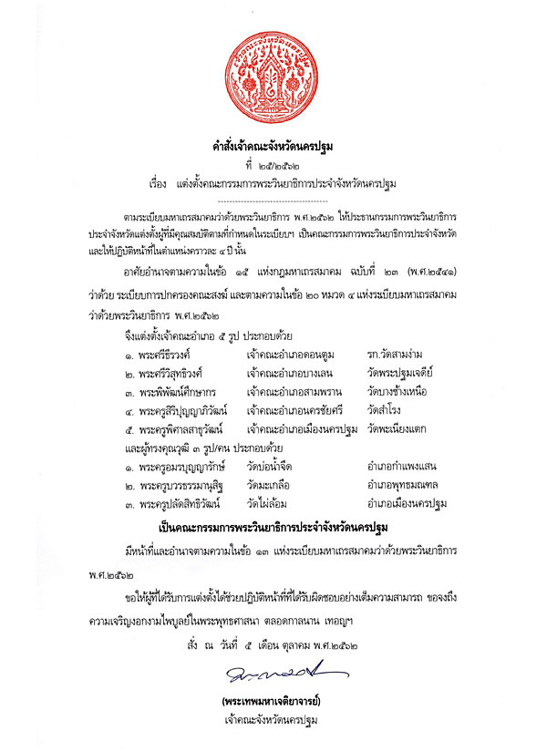 ในการนี้ จังหวัดพิจาณาแล้วเห็นสมควรจึงอนุมัติแต่งตั้งคณะกรรมการพระวินยาธิการ ประจำจังหวัด