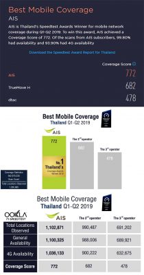 3.เครือข่ายมือถือที่ครอบคลุมมากที่สุดในไทย (Thailand’s Best Mobile Coverage) ได้แก่ AIS เป็นอันดับ 1 ด้วยคะแนน 772 คะแนน จากการทดสอบในพื้นที่ที่ให้บริการอินเทอร์เน็ตมากกว่า 1 ล้านพื้นที่ ในช่วงเดือนมกราคม-มิถุนายน 2562