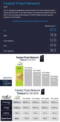 2.เครือข่ายอินเทอร์เน็ตบ้านที่เร็วที่สุดในไทย (Thailand’s Fastest Fixed Network) ได้แก่ AIS เป็นอันดับ 1 ด้วยคะแนนความเร็วในการให้บริการอินเทอร์เน็ต 83.51 ความเร็วเฉลี่ยการดาวน์โหลด 225.94 Mbps ความเร็วเฉลี่ยการอัพโหลด 113.02 Mbps และค่าหน่วงเวลาในการตอบสนอง 12 ms จากการทดสอบมากกว่า 11 ล้านครั้ง ในช่วงเดือนมกราคม-มิถุนายน 2562