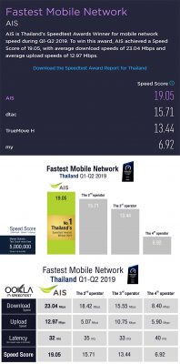 1.เครือข่ายมือถือที่เร็วที่สุดในไทย (Thailand’s Fastest Mobile Network) ได้แก่ AIS เป็นอันดับ 1 ด้วยคะแนนความเร็วในการให้บริการอินเทอร์เน็ต อยู่ที่ 19.05 มีความเร็วเฉลี่ยการดาวน์โหลด 23.04 Mbps ความเร็วเฉลี่ยการอัพโหลด 12.97 Mbps และค่าหน่วงเวลาในการตอบสนอง 32 ms พร้อมครองอันดับ 1 เครือข่ายมือถือที่เร็วที่สุดในพื้นที่กรุงเทพมหานคร ซึ่งเป็นจังหวัดที่มีการใช้งานเน็ตหนาแน่นที่สุด โดยวัดจากผู้ใช้มือถือในประเทศไทย ที่ร่วมกดทดสอบความเร็วอินเทอร์เน็ตมากกว่า 5 ล้านครั้ง ในช่วงเดือนมกราคม-มิถุนายน 2562