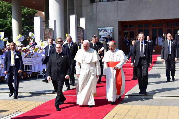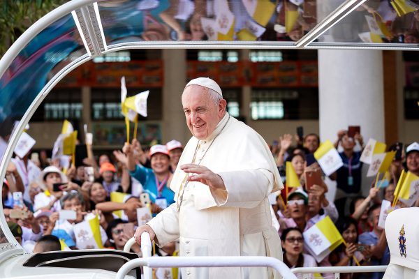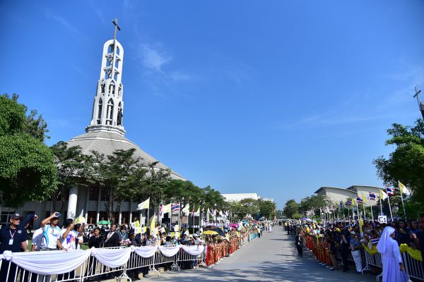 จากนั้นทรงประทับรถพระประเทียบเปิดประทุน เพื่อประทานพระวโรกาสให้คริสตชนที่มาเข้าเฝ้าบริเวณโดยรอบของวัดนักบุญเปโตรได้เข้าเฝ้าอย่างใกล้ชิด เมื่อเสด็จโดยรถพระประเทียบเปิดประทุนโดยรอบบริเวณแล้ว เสด็จเข้าสู่ภายในโบสถ์นักบุญเปโตร ผู้แทนบาทหลวง นักบวชหญิง สามเณร และครูคำสอน ถวายมาลัยข้อพระกรแด่สมเด็จพระสันตะปาปา แล้วเสด็จไปทรงวางช่อดอกไม้คารวะพระรูปนักบุญเปโตร อัครสาวก ผู้เป็นพระสันตะปาปาองค์แรก และเป็นองค์อุปถัมภ์ของวัด ต่อด้วยการร่วมกันขับร้องเพลง “หนทางแห่งรัก” หลังจากนั้น สมเด็จพระสันตะปาปาฟรานซิส ประทานพระโอวาทแก่บรรดาบาทหลวง นักพรต สามเณร ผู้ฝึกหัด ครูคำสอน เมื่อจบพระโอวาทแล้ว ทุกคนพร้อมใจกันภาวนาเพื่อกระแสเรียก เพื่อขอพระเจ้าได้โปรดประทานผู้สนใจถวายชีวิตเป็นบาทหลวง นักบวช นักพรตให้มากยิ่งขึ้นเพื่อการงานแพร่พระคริสตธรรมจะดำเนินไปด้วยดี และร่วมขับร้องเพลง “หนทางพระคริสต์”