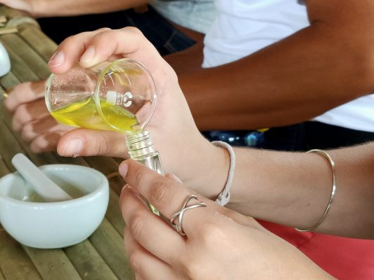 2. น้ำมันนวดสมุนไพรออร์แกนิก เมื่อเลือกแพคเกจกิจกรรมที่ ปฐม ออร์แกนิก วิลเลจ ความพิเศษของน้ำมันนวด คือ ใช้สมุนไพรที่ผลิตในระบบอินทรีย์ ทั้งไพล พิมเสน การบูรและ เมนทอล ซึ่งมีสรรพคุณเย็น ทำให้ช่วยผ่อนคลาย รวมถึงช่วยในเรื่องของการคลายกล้ามเนื้อ ลดอาการอักเสบ แมลงสัตว์กัดต่อย ที่สำคัญ เป็นสูตรพิเศษเฉพาะของปฐมที่ให้ความหอมนาน มีขั้นตอนไม่ยุ่งยาก สามารถนำความรู้กลับไปทำใช้เองได้ที่บ้าน