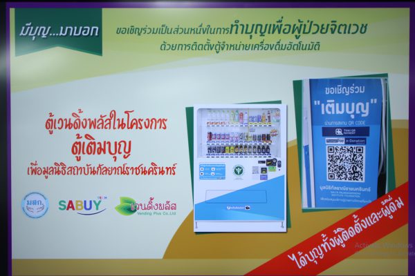 ดังนั้นเพื่อให้โคงการต่อเนื่องและยั่งยืน จึงได้จัดทำโครงการ “ตู้เติมบุญ เพื่อมูลนิธิสถาบันกัลยาณ์ราชนครินทร์” โดยการติดตั้งตู้กดน้ำกระป๋องอัตโนมัติเวนดิ้งพลัส ภายใต้ชื่อ “ตู้เติมบุญ“ณ สถาบันกัลยาณ์–ราชนครินทร์ โดยเป็นการให้บริการเครื่องดื่มเย็น เครื่องดื่มกระป๋อง น้ำอัดลม น้ำผลไม้ น้ำเปล่า น้ำแร่น้ำนมถั่วหลือง และผลิตภัณฑ์อื่นๆ อีกหลากหลาย เป็นการอำนวยความสะดวกแก่ผู้รับบริการผู้ปวย และญาติรวมทั้งบุคลากรตลอด 24 ชั่วโมง ในราคาสวัสดิการ ซึ่งรายได้จากการจำหน่ายเครื่องดื่มดังกล่าว ทางเวนดิ้งพลัสจะมอบรายได้จากการขายส่วนหนึ่งให้กับมูลนิธิสถาบันกัลยาณ์ราชนครินทร์ โดย เพื่อใช้ในการช่วยเหลือดูแลผู้ปวยจิตเวช ที่ด้อยโอกาสและยากไร้ เป็นกำลังใจให้พวกเขารู้สึกว่าพวกเขาไม่ได้ถูกทอดทิ้ง ตลอดจนใช้ในการสร้างและจัดซื้อวัสดุครุภัณฑ์และอุปกรณ์ทางการแพทย์ที่ทันสมัย เพื่อตอบสนองความต้องการของผู้ปวยทางจิตเวชในปัจุบันที่ยังขาดแคลนเนื่องจากมีอัตราการเพิ่มจำนวนผู้ป่วยมากขึ้นทั้งผู้ป่วยในและผู้ปวยนอกจำนวนเตียงผู้ปวยในไม่เพียงพอต่อการให้บริการมีผู้ป่วยล้นตึก มีความจำเป็นต้องขยายเตียงและขยายพื้นที่บริการผู้ปวยนอก เพื่อรองรับผู้ป่วยจากเขตบริการสุขภาพที่ 5 ประกอบด้วย 8 จังหวัด คือ นครปฐม สมุทรสาคร สมุทรสงคราม เพชรบุรี ประจวบศีรีขันธ์ ราชบุรี กาญจนบุรี และสุพรรณบุรี และผู้ป่วยในเขตกรุงเทพมหานคร พื้นที่ใกล้เคียงอีก 7 เขต โดยนำร่องติดตั้งตู้ดังกล่าวที่สถาบันกัลยาณ์ราชนครินทร์จำนวน 3 ตู้ เป็นเวลา 4 เดือน (สค. – พ.ย. 2562) และทางบริษัทสบายเทคโนโลยี จำกัด(มหาชน) มอบเงินรายได้จากการขายสินค้าให้กับมูลนิธิสถาบันกัลยาณ์ราชนครินทร์ เป็นจำนวนงิน 8,082.70 บาท (แปดพันแปดสิบสองบาทเจ็ดสิบสตางค์)