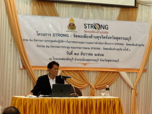 พร้อมกล่าวว่า สำนักงาน ป.ป.ช. ประจำจังหวัดสุพรรณบุรี ร่วมกับชมรม STRONG – จิตพอเพียงต้านทุจริต จังหวัดสุพรรณบุรี จัดกิจกรรมดังกล่าวขึ้นเพื่อผลักดันการป้องกันการทุจริตเชิงรุกด้วยการสร้างเสริมให้บุคคลและชุมชนมีจิตพอเพียงต้านทุจริต เริ่มดำเนินการตั้งแต่ปีงบประมาณ พ.ศ. ๒๕๖๑ และต่อเนื่องมาจนถึงปัจจุบัน
