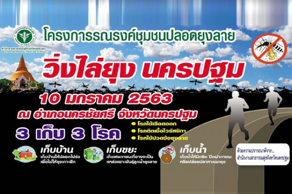 สำนักงานสาธารณสุขจังหวัดนครปฐม และสำนักงานสาธารณสุขอำเภอนครชัยศรี เล็งเห็นความสำคัญของการกำจัดแหล่งเพาะพันธุ์ยุงลาย จึงได้จัดกิจกรรมรณรงค์ชุมชนปลอดยุง “วิ่งไล่ยุง”ครั้งนี้ขึ้น โดยมีวัตถุประสงค์เพื่อสร้างความตระหนักและกระตุ้นเตือนให้ประชาชนเห็นความสำคัญของการกำจัดแหล่งเพาะพันธุ์ยุงลายในบ้านตนเองและในสถานที่สำคัญต่าง ๆ นำไปสู่การป้องกันการระบาดของโรค รวมทั้งสนับสนุนให้ประชาชนได้ออกกำลังกาย ทำให้มีสุขภาพที่ดีห่างไกลจากโรคและภัยสุขภาพ เป็นกิจกรรมเดิน – วิ่งรณรงค์กำจัดแหล่งเพาะพันธุ์ลดโรคไข้เลือดออก ไข้ซิก้า และไข้ปวดข้อยุงลาย ระยะทาง 4.5 กิโลเมตร