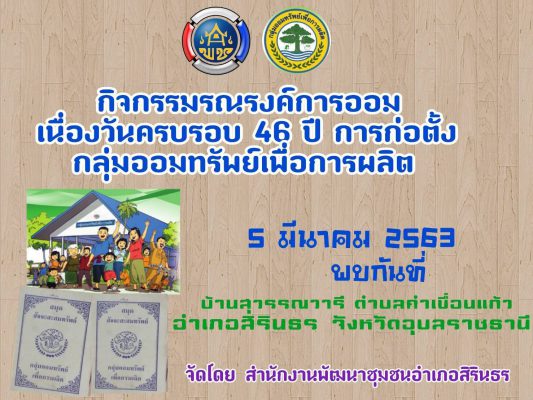 กรมการพัฒนาชุมชน จัดกิจกรรม “สัปดาห์รณรงค์การประหยัดและการออม” เนื่องในโอกาสครบรอบ 46 ปี วันคล้ายวันก่อตั้งกลุ่มออมทรัพย์เพื่อการผลิต ระหว่างวันที่ 6 – 8 มีนาคม 2563 ในพื้นที่ 76 จังหวัดทั่วประเทศ