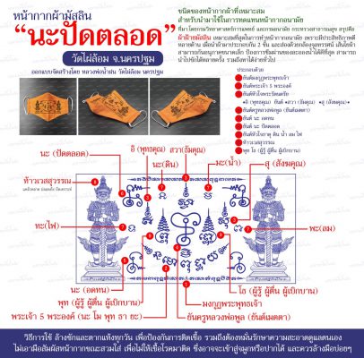 นอกจากนั้น หน้ากากผ้า “นะปัดตลอด” ทางวัดไผ่ล้อม จ.นครปฐม โดยหลวพี่น้ำฝน ได้ลงพุทธคุณประกอบด้วย ยันต์ครูหลวงพ่อพูล ยันต์พระเจ้า 5 พระองค์ ยันต์หัวใจพระรัตนตรัย ยันต์มงกุฏพระพุทธเจ้า ยันต์ นะ อดทน ยันต์ นะ ปัดตลอด ยันต์หัวใจธาตุ ดินน้ำ ลม ไฟ และท้าวเวสสุวรรณ