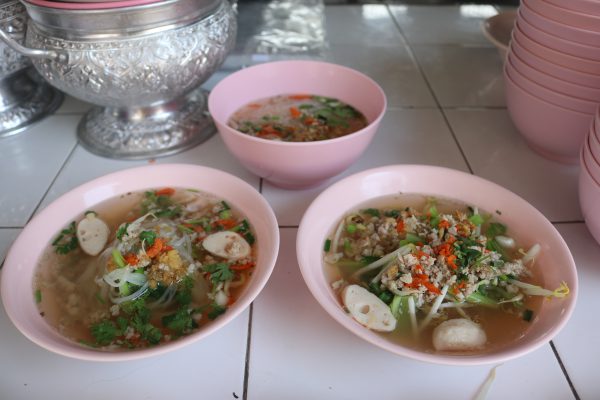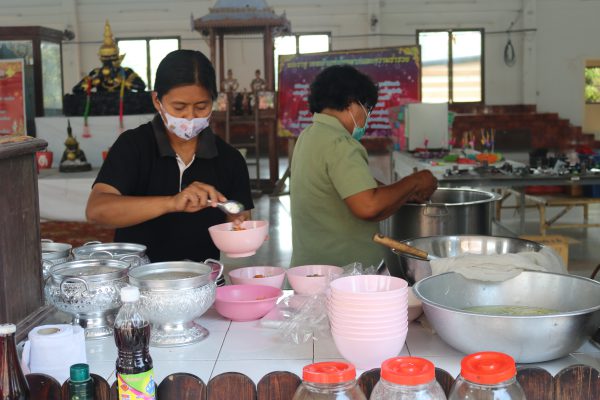 เพื่อลดค่าใช้จ่ายในการครองชีพ โดยแต่ละวัน ก๋วยเตี๋ยวหมู จะมีชาวบ้านในพื้นที่ ซึ่งเป็นแม่ครัวฝีมือดี และกรรมการวัด หมุนเวียนสลับสับเปลี่ยน แวะเวียนมาช่วยกันบริการ ช่วยกันทำ และบริการจัด น้ำดื่ม เย็นๆ ชื่นใจ โดยทำการ เปิดโรงทานให้ทานฟรี แบบกลับบ้าน ตั้งแต่ช่วงเช้า จนถึงช่วงเย็น
