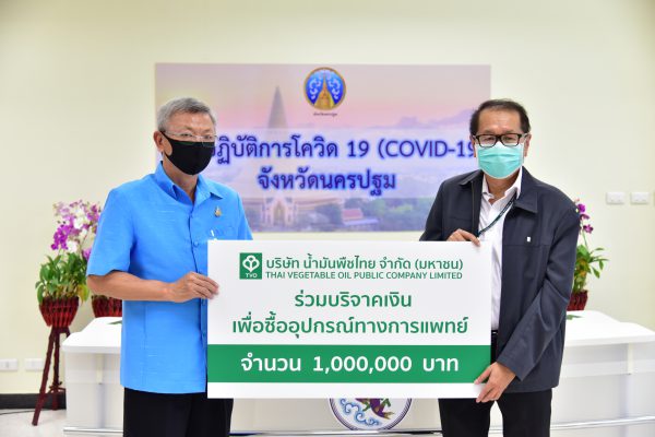 วันที่ 7 เมษายน 2563 ที่ห้องประชุมศาลากลางจังหวัดนครปฐม นายชาญนะ เอี่ยมแสง ผู้ว่าราชการจังหวัดนครปฐม เป็นประธานรับมอบเงินบริจาค จำนวน 1,000,000 บาท จากบริษัท น้ำมันพืชไทย จำกัด (มหาชน) โดยนายไพโรจน์ อุทัยทรัพย์ ประธานเจ้าหน้าที่ปฏิบัติการด้านการผลิต เป็นผู้แทนในการมอบเงินบริจาค เพื่อสมทบทุนจัดซื้อวัสดุอุปกรณ์และเวชภัณฑ์ทางการแพทย์ แจกจ่ายให้กับแพทย์ พยาบาล และเจ้าหน้าที่ สังกัดสำนักงานสาธารณสุขจังหวัดนครปฐม โรงพยาบาลชุมชน และโรงพยาบาลส่งเสริมสุขภาพตำบลในจังหวัดนครปฐม เพื่อใช้ปฏิบัติหน้าที่ จากสถานการณ์การแพร่ระบาดของไวรัส COVID-19 ส่งผลให้บุคลากร และเจ้าหน้าที่ มีความจำเป็นต้องใช้วัสดุอุปกรณ์และเวชภัณฑ์ทางการแพทย์เป็นจำนวนมาก