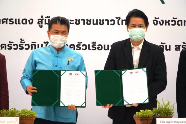 “โชคดีที่บริษัท อีสต์ เวสต์ ซีด จำกัด ซึ่งเป็นเป็นผู้ผลิตเมล็ดพันธุ์ผักหลายร้อยชนิด ตราศรแดงมีผู้บริหารที่มีวิสัยทัศน์ไปในทางเดียวกันที่อยากเห็นประชาชนมีความสุข มีคลังอาหารเก็บไว้บนพื้นดินที่ไม่มีวันหมด จึงได้สนับสนุนโครงการด้วยการลงนามในMOU และมอบเมล็ดพันธุ์ผักตราศรแดง ให้แก่กรมการพัฒนาชุมชนจำนวนทั้งสิ้น 45,600 เพื่อนำเมล็ดพันธุ์ความสุขที่ปลูกได้นี้ ไปส่งมอบให้แก่ประชาชนทั้ง 76 จังหวัด ให้เมล็ดพันธุ์เหล่านี้เติบโตเป็นอาหารแก่ประชาชนที่เข้าร่วมโครงการปลูกพืชผักสวนครัวรั้วกินได้ที่กำลังรณรงค์ต่อไป จึงขอขอบคุณผู้บริหาร และพนักงานของเมล็ดพันธุ์ตราศรแดงทุกคน