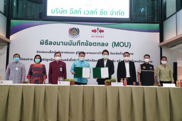วันที่ 8 เมษายน 2563 เวลา 9.00 น. ณ บริษัท อีสท์ เวสท์ ซีด จำกัด อำเภอไทรน้อย จังหวัดนนทบุรี นายสุทธิพงษ์ จุลเจริญ อธิบดีกรมการพัฒนาชุมชน กระทรวงมหาดไทย และนายวิชัย เหล่าเจริญพรกุล ผู้จัดการทั่วไปบริษัทอีสท์ เวสท์ ซีด จํากัด ได้ร่วมลงนามบันทึกข้อตกลงความร่วมมือ (Memorandum of Understanding : MOU) เพื่อร่วมกันดำเนินการตามแผนปฏิบัติการ “90 วัน ปลูกผักสวนครัว เพื่อสร้างความมั่นคงทางอาหาร” ซึ่งกรมการพัฒนาชุมชนที่เริ่มปฏิบัติการทั่วประเทศไทยตั้งแต่วันที่ 1 เมษายน 2563 โดยบริษัท อีสต์ เวสต์ ซีด จำกัด ได้สนับสนุนเมล็ดพันธุ์ผักตราศรแดง ให้แก่กรมการพัฒนาชุมชน จำนวนทั้งสิ้น 45,600 ซอง เพื่อแจกจ่ายให้กับประชาชนที่เข้าร่วมโครงการได้นำไปปลูกในครัวเรือน