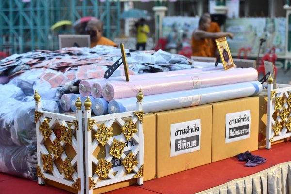 หลวงพี่น้ำฝน ได้กล่าวอีกว่า การเจริญพระพุทธมนต์เป็นบทที่สำคัญที่สุด หน้ากากผ้านี้ช่วยได้ร้อยเปอร์เซน ขอให้ท่านทั้งหลายอนาคตข้างหน้าจะต้องมีพกกันไว้ติดตัวกันตลอด ไม่ว่าจะเป็นหน้ากากแบบไหนก็แล้วแต่ ขอให้ท่านพกแล้วเดินทางไปไหนก็ขอให้ใส่ เพื่อจะได้ใช้ มันใช้ได้จริง แล้วก็พูดง่ายๆทำให้โรคภัยไข้เจ็บมันทุเลาเบาบางเป็นไปได้อย่างแน่นอน ถึงได้บอกว่าอนาคตข้างหน้ามันต้องมีหน้ากากแบบนี้ใช้ไปตลอดชีวิตแล้ว และตอนนี้ทางวัดทำทุกสิ่งทุกอย่างทันหมดแล้ว หน้ากากผ้ามัสลิน “ยันต์นะปัดตลอด”ได้กลุ่มชาวบ้านที่เย็บหน้ากากอนามัยอย่างแท้จริง เป็นชาวบ้านล้วนๆเลยที่เป็นผู้ผลิต อาตมาก็เป็นผู้ที่ให้งานญาติโยมทั้งหลายไปทำ ในจังหวัดนครปฐมและจังหวัดใก้ลเคียงอีกด้วย ก็ได้รับอานิสงค์ที่ให้ญาติโยมได้มีงานทำ ได้นำ หน้ากากผ้ามัสลิน “ยันต์นะปัดตลอด” ไปเย็บและได้แสดงฝีมืออย่างเต็มที่ พร้อมกันนี้ได้นำ หน้ากากผ้ามัสลิน “ยันต์นะปัดตลอด” ทั้งที่เสร็จแล้วใส่ซองไปรษณีย์ไว้เตรียมส่ง ทั้งที่ตัดแล้ว และเป็นม้วนผืนผ้า ไว้ในพิธีก่อนที่จะจัดส่งได้ในวันพรุ่งนี้ต่อไป ตอนนี้ใครที่จะสั่งมาทางวัดไผ่ล้อมก็พร้อมที่จะส่ง ใครมาก็จะได้ของกลับไปอย่างแน่นอน โดยขอยืนยันว่าตอนนี้ทันแล้ว โดยกลุ่มแม่บ้านทำด้วยฝีมือปราณีต เมื่อท่านได้รับไปก็จะมีแต่ความสุขนั่นเอง แม้กระทั่งตอนนี้ก็มีสื่อของประเทศญี่ปุ่นหลายสำนักให้ความสนใจ มาถ่ายทำเรื่อง หน้ากากผ้ามัสลิน “ยันต์นะปัดตลอด”วัดไผ่ล้อม ก็ขอรณรงค์ให้ใช้หน้ากากอนามัย ซึ่ง “กันไว้ดีกว่าแก้ ถ้าแย่แล้วแก้ไม่ทัน” หลวงพี่น้ำฝน ได้กล่าวทิ้งท้ายไว้
