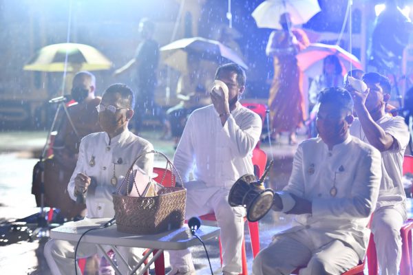 เมื่อวันที่13 เมษายน พ.ศ. 2563 ที่ลานหน้าพระอุโบสถ วัดไผ่ล้อม ตำบลพระปฐมเจดีย์ อำเภอเมือง จังหวัดนครปฐม พระครูปลัดสิทธิวัฒน์ (หลวงพี่น้ำฝน) เจ้าอาวาสวัดไผ่ล้อม นำคณะพระสงฆ์วัดไผ่ล้อม สวดเจริญพระพุทธมนต์เสริมมงคลในวันสงกรานต์ หรือวันขึ้นปีใหม่ไทย เพื่อเสริมมงคลหน้ากากผ้ามัสลิน “ยันต์นะปัดตลอด” เพิ่มความเป็นมงคลกับผู้สวมใส่ ปัดเป่าสิ่งไม่ดี สิ่งไม่เป็นมงคล โรคภัยไข้เจ็บ สิ่งร้ายๆให้ออกไปหายไป จากโลกเรา โดยมีนายสมชาติ(เฮียเงี๊ยบ) สาลีพัฒนา เจ้าของร้านก๋วยเตี๋ยวลูกชิ้นปลานายเงี๊ยบพุทธมณฑลสาย4 เป็นประธานฝ่ายฆราวาส จุดธูปเทียนบูชาพระรัตนตรัย และมีพราหมณ์คณะศิษย์มีครู อ่านโองการ บูชาเทพยดา สิ่งศักดิ์สิทธิ์ ในสากล ก่อนที่พระครูปลัดสิทธิวัฒน์ หลวงพี่น้ำฝน เจ้าอาวาสวัดไผ่ล้อม จะนำคณะพระสงฆ์วัดไผ่ล้อม สวดเจริญพระพุทธมนต์ ท่ามกลางสายฝนที่ตกลงมาชะล้างสิ่งไม่ โรคภัยร้ายต่างๆ ด้วยพระคาถา บทสวดธรรมจักรกัปปะวัตตะนะสูตร พระคาถาชินบัญชร ยอดพระกัณฑ์ไตรปิฎก. บทสวดมหาสมัยสูตร. มงคลจักรวาลใหญ่ คาถาป้องกันภัยสิบทิศ บทจันทะปริตตปาฐิ บทสุริยปริตตปาฐิ ฯลฯเพื่อเป็นความเป็นสิริมงคล ขจัดปัดเป่า โรคร้ายๆให้ออกไปหายไป ให้คงไว้แต่สิ่งที่ดีมีมงคล เพื่อให้ หน้ากากผ้ามัสลิน“ยันต์นะปัดตลอด” มีความเป็นมงคลกับผู้สวมใส่ ตลอดไป