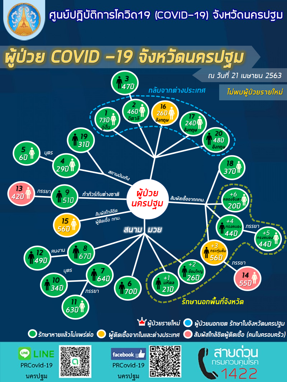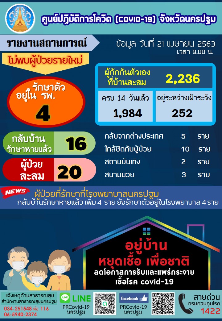 สถานการณ์ COVID-19 จังหวัดนครปฐม ประจำวันที่ 21 เม.ย. 63 ไม่พบผู้ป่วยรายใหม่เพิ่มต่อเนื่องมา 14 วันแล้ว (ตั้งแต่วันที่ 8 เม.ย. 63) และมีผู้ป่วยรักษาหายกลับบ้านเพิ่มอีก 4 ราย คือรายที่ 10,17,19 และรายที่ 20 ผู้ป่วยกำลังรักษาในโรงพยาบาลในขณะนี้เหลือ 4 รายเท่านั้น คือ (รายที่ 13,14,15,16) รักษาหายและกลับบ้านได้แล้ว 16 ราย ผู้ป่วยยืนยันสะสมทั้งหมด 20 ราย