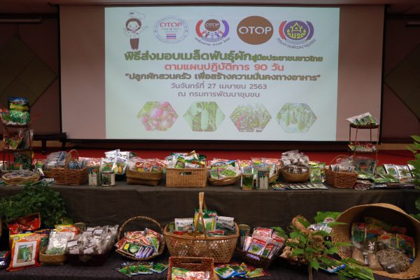 วันที่ 27 เมษายน 2563 เวลา 14.00 น. นายสุทธิพงษ์ จุลเจริญ อธิบดีกรมการพัฒนาชุมชน รับมอบเมล็ดพันธุ์ผักสวนครัวจากเครือข่าย OTOP โดยมีนายวัชรพงศ์ ระดมสิทธิพัฒน์ ประธานบริษัท โอทอปอินเตอร์เทรดเดอร์ ประเทศไทย จำกัด พร้อมด้วย ผู้แทนเครือข่าย OTOP ภาคกลาง เครือข่าย OTOP ชวนชิม และเครือข่ายศิลปิน OTOP เป็นตัวแทนส่งมอบ เพื่อสนับสนุนแผนปฏิบัติการ 90 วัน “ปลูกผักสวนครัว เพื่อสร้างความมั่นคงทางอาหาร” และแบ่งเบาภาระค่าใช้จ่ายของประชาชนในช่วงการระบาดของโควิด-19 ด้วยการปลูกผักบริโภคเองภายในครัวเรือน