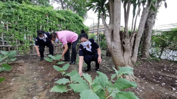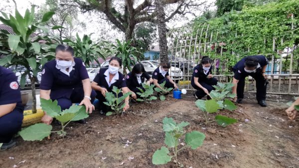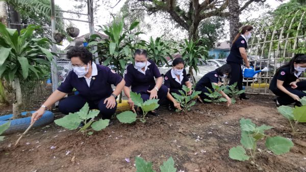 นายกเหล่ากาชาดจังหวัดตรังนำสมาชิกเหล่ากาชาด ปลูกผักสวนครัว ตามหลักปรัชญาเศรษฐกิจพอเพียง ลดค่าใช้จ่ายในครัวเรือนท่ามกลางภาวะวิกฤตจากโรคโควิด-19