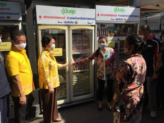 โดยได้รับเกียรติจาก คุณหญิงแจ่มใส ศิลปอาชา นายนิมิต วันไชยธนวงศ์ ผู้ว่าราชการจังหวัดสุพรรณบุรี นางจุฬารัตน์ วันไชยธนวงศ์ นายกเหล่ากาชาดจังหวัด และประธานแม่บ้านมหาดไทย ตลอดจน ภาคเอกชนอีกเป็นจำนวนมาก เข้าร่วมพิธี โดยคุณหญิงแจ่มใส กล่าวขณะเห็นผู้ได้รับผลกระทบต่างทยอยเข้ามาหยิบสิ่งของในตู้ ว่า เป็นภาพบรรยากาศของสังคมแห่งการให้ การแบ่งปัน ยิ่งให้ก็จะยิ่งได้ ใจเราก็มีความสุข และเราจะรอดไปด้วยกัน