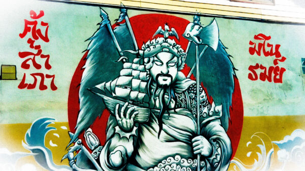 หลังจากคณะของเรากราบสัดดาระขอพรขอโชคลาภกันแล้ว ก็เดินชม ตลาดเก่าคุ้งสำเภา ซึ่งอยู่ติดกับศาลเจ้าพ่อกวนอู โดยชุมชนได้ร่วมกับอาจารย์คณะมัณฑนศิลป์ มหาวิทยาลัยศิลปากร และคณะศิลปินกราฟิตี สร้างสรรค์ศิลปะบนกำแพง หรือที่เรียกว่าสตรีทอาร์ต เพื่อสร้างสีสันคืนชีวิตให้แก่ตลาดเก่า 100 ปี