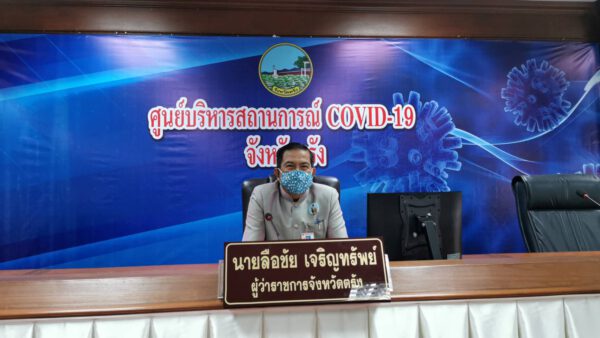 ที่ศูนย์บริหารสถานการณ์โควิด -19 ศาลากลางจังหวัดตรัง นายลือชัย เจริญทรัพย์ ผู้ว่าราชการจังหวัดตรัง เป็นประธานประชุมศูนย์บริหารสถานการณ์การแพร่ระบาดของโรคติดเชื้อไวรัสโคโรนา 2019 (COVID-19) เพื่อติดตามผลการดำเนินงานตามมาตรการป้องกันโรคตามที่ราชการกำหนด เพื่อป้องกันการแพร่ระบาดของโรค COVID-19 ตามคำสั่งศูนย์บริหารสถานการณ์การแพร่ระบาดของโรคติดเชื้อไวรัสโคโรนา 2019 (COVID-19) ที่ 5/2563