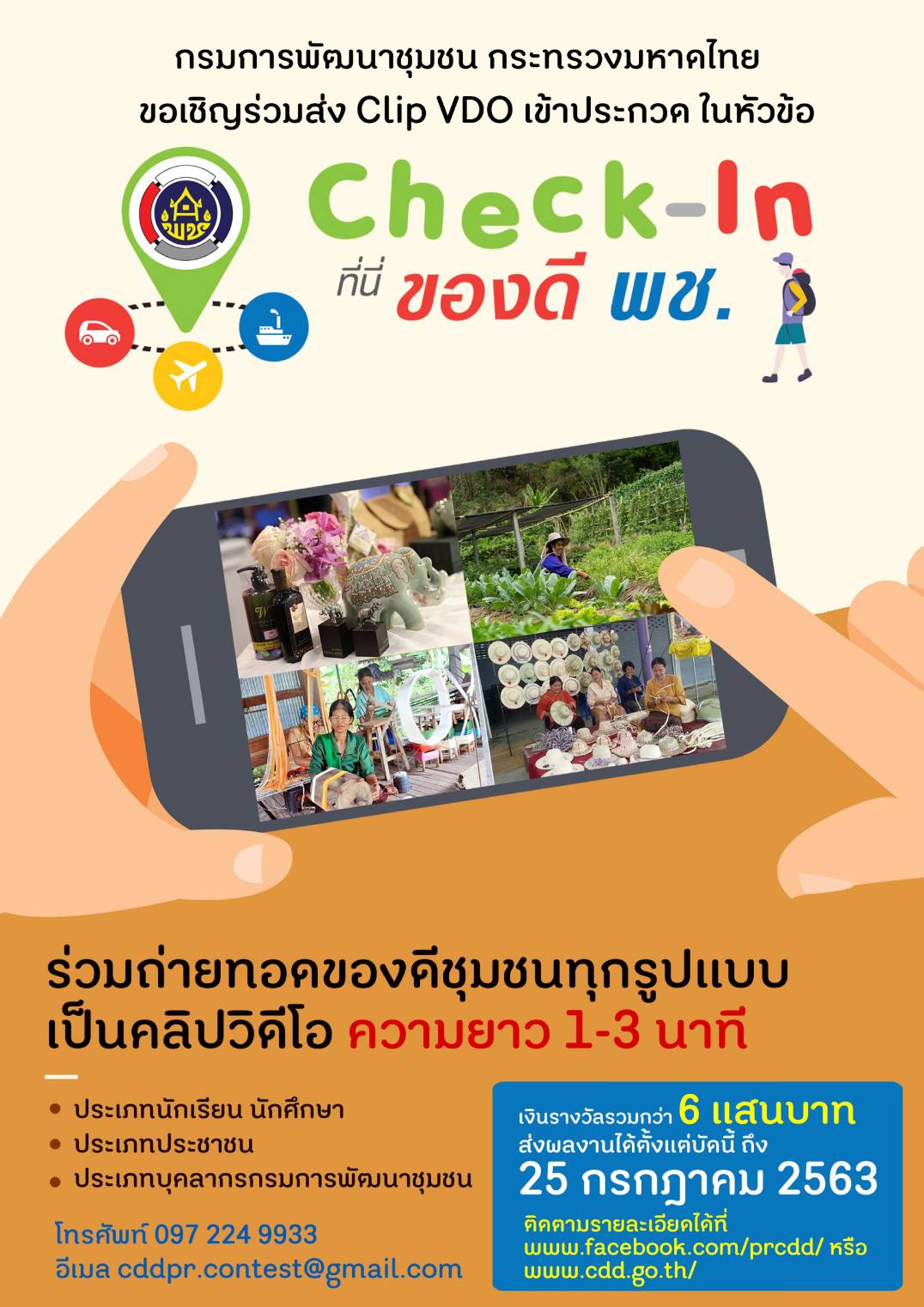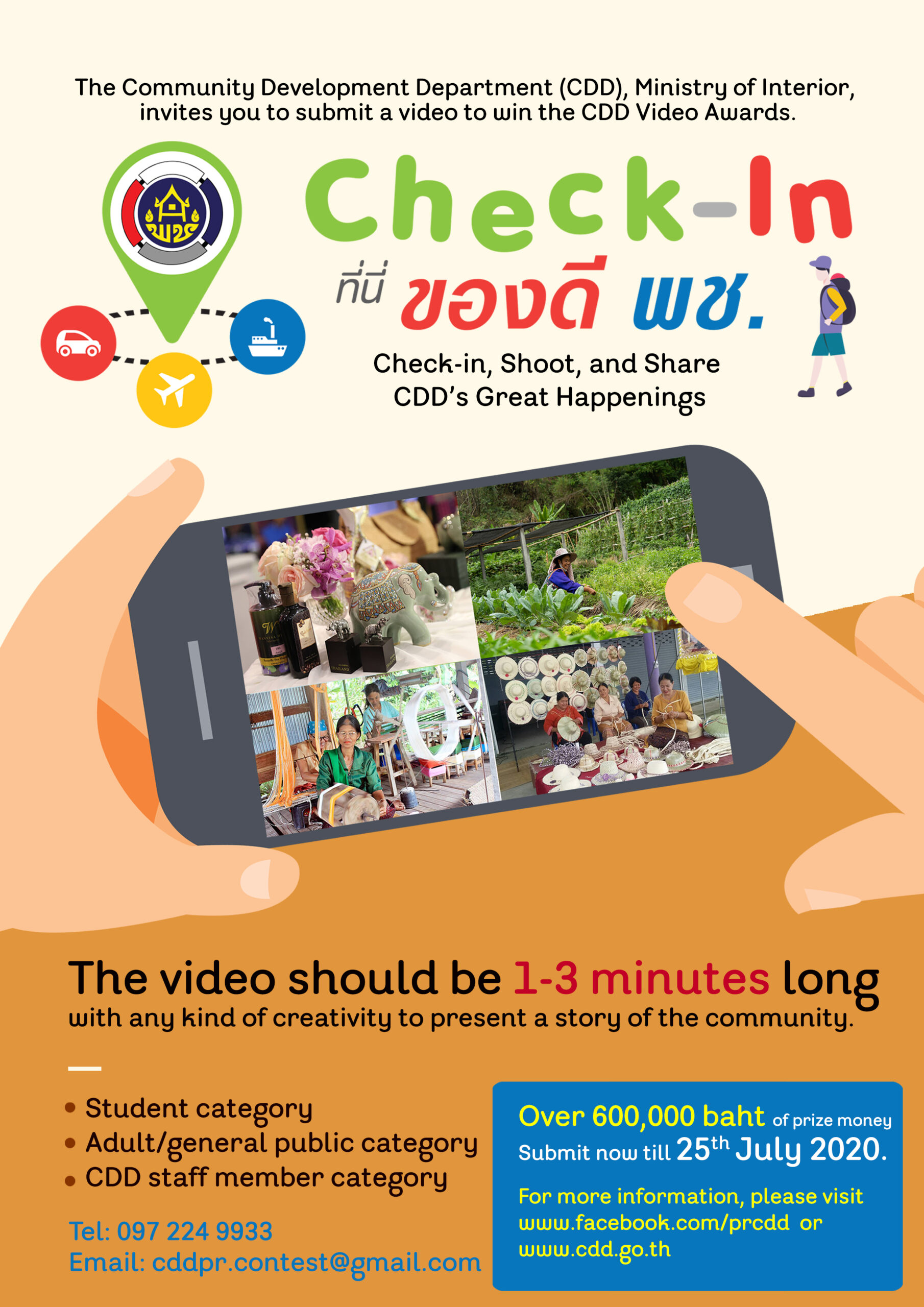 ส่งผลงานได้ตั้งแต่วันที่ 25 มิถุนายน – 25 กรกฎาคม 2563 ซึ่งผลงานที่ผ่านรอบคัดเลือก จะได้รับการเผยแพร่ใน Youtube ของกรมการพัฒนาชุมชน และนำ Link ไปเผยแพร่ใน Fanpage กรมการพัฒนาชุมชน www.facebook.com/prcdd เพื่อให้ผู้เข้าชมทั่วไปร่วมกด Like และ Share ให้คะแนนในรางวัล Popular Vote สอบถามรายละเอียดเพิ่มเติมได้ที่ โทรศัพท์ 097 224 9933 หรืออีเมล cddpr.contest@gmail.com