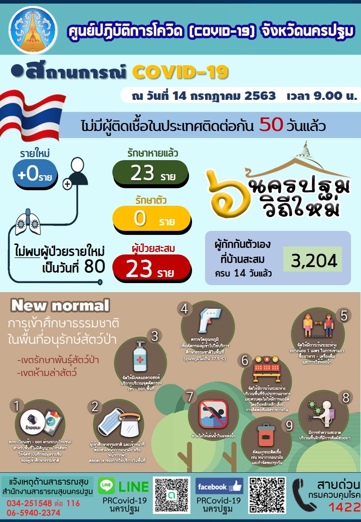 นายชาญนะ เอี่ยมแสง ผู้ว่าราชการจังหวัดนครปฐม กล่าวว่า จากที่ศูนย์บริหารสถานการณ์การแพร่ระบาดของโรคติดเชื้อไวรัสโคโรนา 2019 (โควิด-19) หรือ ศบค. แถลงวานนี้ (13 ก.ค.63) กรณีมีชาวต่างชาติที่เดินทางเข้ามาในประเทศไทยและตรวจพบเชื้อโควิด-19 จำนวน 2 ราย รายแรกเป็นทหารเดินทางมาจากประเทศอียิปต์ พร้อมคณะ จากการไล่เรียงเวลาทั้งหมดสรุปได้ว่า มีผู้ที่มีความเสี่ยงสูงในการติดเชื้อจำนวน 9 ราย และผู้สัมผัสที่มีความเสี่ยงติดเชื้อต่ำ จำนวน 9 ราย รายที่สอง เป็นเด็กหญิง อายุ 9 ปี มีผู้ที่มีความเสี่ยงสูงจากกรณีนี้จำนวน 7 ราย และมีผู้สัมผัสมีความเสี่ยงต่ำ จำนวน 15 ราย ซึ่งอยู่ระหว่างดำเนินการตรวจสอบ ดังนั้นจึงขอความร่วมมือชาวนครปฐมทุกคนร่วมกันเฝ้าระวังและป้องกันการแพร่ระบาดของเชื้อไวรัสโควิด-19 โดยดำเนินการตามแนวทางนครปฐม 6 วิถีใหม่ อย่างเคร่งครัด คือ อยู่ห่างไว้ ใส่แมสก์กัน หมั่นล้างมือ ถือหลักสะอาด ปราศจากแออัด เคร่งครัดไทยชนะ