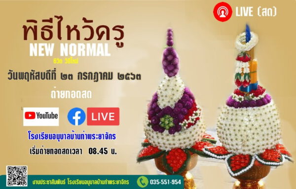 ผอ.ร.ร.อนุบาลบ้านท่าฯ กล่าวเพิ่ม สำหรับรูปแบบพิธีไหว้ครู New normal โรงเรียนได้นำสื่อโซเชียลมาใช้ในพิธีไหว้ครูครั้งนี้ ถือเป็นแห่งแรกในการสร้างมิติใหม่ของโรงเรียนเกือบ 30,000 แห่งในสังกัดสำนักงานคณะกรรมการการศึกษาขั้นพื้นฐาน โดยตลอดพิธีการไหว้ครู กว่า 1 ชั่วโมงนั้น ได้ยึดหลักการเว้นระยะห่างทางสังคมอย่างเคร่งครัด เพื่อความปลอดภัยจากการแพร่ระบาดของไวรัสโควิด-19 อย่างเคร่งครัด โดยได้แบ่งสถานทีเพื่อใช้ดำเนินการจัดกิจกรรมพิธีไหว้ครูออกเป็น 2 ส่วน คือ ส่วนที่ 1 ห้องประชุมบุญชู จันทร์สุวรรณ ซึ่งเป็นห้องประชุมใหญ่จะมีเฉพาะผู้บริหารสถานศึกษา คณะครูฝ่ายบริหาร วงดนตรีไทย และส่วนที่ 2 จะเป็นห้องเรียนซื่งมีเกือบ 40 ห้องเรียน นักเรียนจะไม่มานั่งรวมกันในห้องประชุมเหมือนทุกๆปีที่ผ่านมา แต่จะเปลี่ยนมานั่งทำพิธีในห้องเรียนของตนเอง โดยกำหนดให้แต่ละห้องเรียนส่งตัวแทนจำนวน 2 คน เดินถือพานไหว้ครูนำมามอบให้กับคณะผู้บริหาร สำหรับนักเรียนที่อยู่ในห้องเรียนก็จะทำพิธีไหว้ครูไปพร้อมกัน โดยจะมอบดอกไม้ธูปเทียนให้กับครูประจำชั้นของตนเอง ระหว่างการดำเนินพิธีการไหว้ครูตั้งแต่เริ่มต้นจนจบนั้น นักเรียนที่อยู่ตามห้องเรียนต่างๆเกือบ 40 ห้อง ก็จะรับชมสัญญาณภาพและเสียงพร้อมกับปฏิบัติขั้นตอนต่างๆของพิธีไหว้ครูผ่านการถ่ายทอดสดจากช่องทางสื่อโซเชียล คือ Youtube และ Facebook Live ทางหน้าจอโทรทัศน์ LED ขนาดใหญ่ซึ่งติดตั้งไว้ในห้องเรียนของตนเองตั้งแต่เวลา 08.45 น.เป็นต้นไป