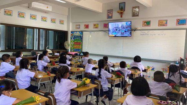 สำหรับนักเรียนที่อยู่ในห้องเรียนก็จะทำพิธีไหว้ครูไปพร้อมกัน โดยจะมอบดอกไม้ธูปเทียนให้กับครูประจำชั้นของตนเอง ระหว่างการดำเนินพิธีการไหว้ครูตั้งแต่เริ่มต้นจนจบนั้น นักเรียนที่อยู่ตามห้องเรียนต่างๆเกือบ 40 ห้อง ก็จะรับชมสัญญาณภาพและเสียงพร้อมกับปฏิบัติขั้นตอนต่างๆของพิธีไหว้ครูผ่านการถ่ายทอดสดจากช่องทางสื่อโซเชียล คือ Youtube และ Facebook Live ทางหน้าจอโทรทัศน์ LED ขนาดใหญ่ซึ่งติดตั้งไว้ในห้องเรียนของตนเองตั้งแต่เวลา 08.45 น.เป็นต้นไป
