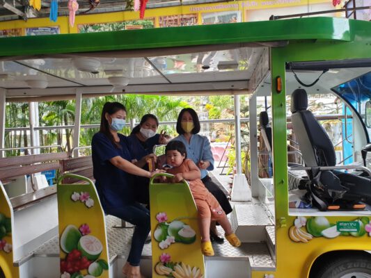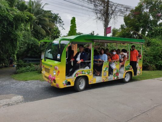 3. เกาะลัดอีแท่น สักการะหลวงพ่อวัดไร่ขิง ป้อนนมปลาคราฟ นั่งรถรางชมสวนหมาก-สวนส้มโอ ซื้อของฝากสินค้า OTOP ของดีอำเภอสามพราน บัตรนั่งรถรางท่านละ 100 บาท ซื้อ 1 ใบรับเพิ่ม 1 ใบ พร้อมคูปองสำหรับซื้อสินค้าชุมชนตามจุดบนเส้นทางรถราง