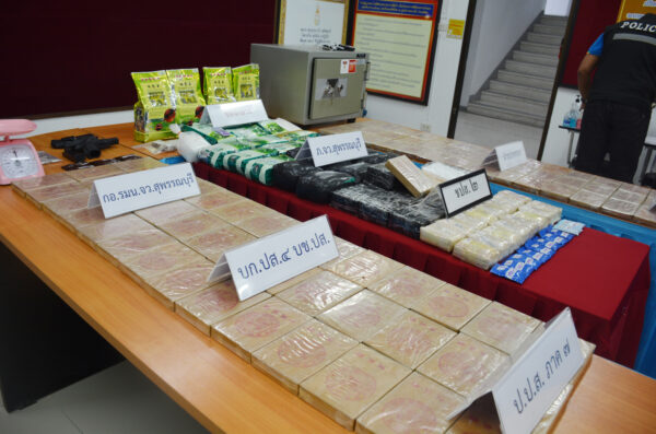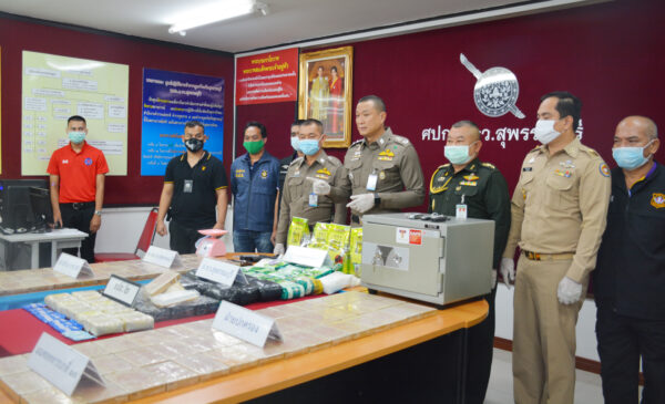 เมื่อเวลา 11.30 น. วันที่ 27 ส.ค. พล.ต.ต.นิธิธร จินตกานนท์ ผบก.ภ.จว.สุพรรณบุรี ชุดปราบปรามยาเสพติด ภ.จว.สุพรรณบุรี พร้อมด้วย พ.ต.อ.ธนเดช ตันติอาภา รอง ผบก.ภ.จว.สุพรรณบุรี ร่วมกับ กองบังคับการตำรวจ ปปส. มทบ.17 ตำรวจ ปปส.ภาค 7 แถลงข่าวจับกุมผู้ต้องหาค้ายาเสพติดรายใหญ่ได้ของกลางประกอบด้วย ยาเค 20 กิโลกรัม เฮโรอิน 40 กิโลกรัม ยาไอซ์ 4 กิโลกรัม ยาบ้า 34,000 เม็ด กัญชาแห้ง 59 กรัม พร้อมรถยนต์ 3 คัน เงินสดจำนวน 110,000 บาท ทองรูปพรรณ และพระเลี่ยมทอง 38 รายการและผู้ต้องหา 5 ราย ประกอบด้วย 1.นายทัศนพร หรือโย พันธุสุข อายุ 28 ปี อ.ไทรโยค จ.กาญจนบุรี 2. น.ส.ดวงกมล ปัชชา อายุ 23 ปี อ.พนมทวน จ.กาญจนบุรี 3.นายทรงกลด ผิวเกลี้ยง 4.นายยอดธง สิทธิวิไล อายุ 28 ปี อ.ท่าม่วง จ.กาญจนบุรี 5.น.ส.ณัฐธิดา ชื่นขำ อายุ 24 ปี อ.ท่าม่วง จ.กาญจนบุรี