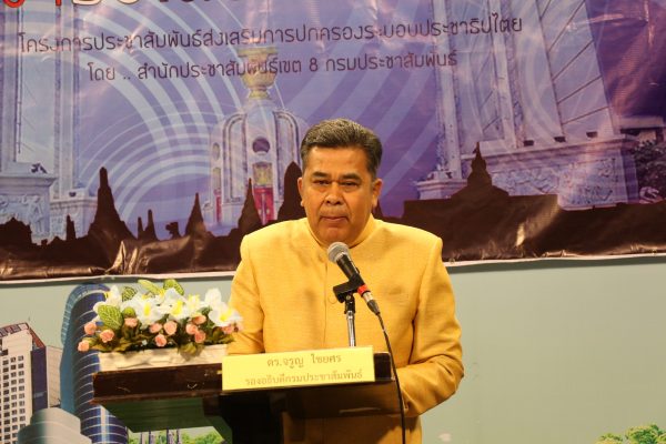 สำนักประชาสัมพันธ์เขต ๘ กาญจนบุรี กรมประชาสัมพันธ์ในฐานะหน่วยงานรัฐที่มีภารกิจและบทบาทหน้าที่ในด้านการประชาสัมพันธ์และสื่อสารสร้างความรู้ความเข้าใจแก่ประชาชน จึงได้จัดทำโครงการประชาสัมพันธ์ส่งเสริมการปกครองระบอบประชาธิปไตยเพื่อให้ประชาชนกลุ่มเป้าหมายรับรู้ข้อมูลข่าวสารมีความรู้ ความเข้าใจที่ถูกต้องเกี่ยวกับการปกครองระบบประชาธิปไตย เห็นความสำคัญให้ความร่วมมือไปใช้สิทธิผ่านสื่อสารมวลชน กิจกรรมการประชาสัมพันธ์และเครือข่ายการประชาสัมพันธ์ของกรมประชาสัมพันธ์ตลอดจนการให้ความร่วมมือและการมีส่วนร่วมในการพัฒนาประเทศต่อไป กิจกรรมครั้งนี้จัดให้มีเวทีเสวนาในหัวข้อ ประชาธิปไตยไทยนิยม กับสังคมไทย มีวิทยากรประกอบด้วย พันตำรวจตรีอุทัย บุญรอด รองผู้อำนวยการการเลือกตั้งประจำจังหวัดกาญจนบุรี คุณนิรันดร์ บุญราช หัวหน้างานสืบสวนสอบสวนและพรรคการเมือง สำนักงานคณะกรรมการการเลือกตั้งประจำจังหวัดกาญจนบุรี และคุณสุรศักดิ์ สิตไทย บรรณาธิการข่าวสำนักข่าว อาร์เอ็นเอ็น ร่วมเวทีเสวนา มี อป.มช. สื่อมวลชนในพื้นที่รับผิดชอบ ๑๖ จังหวัดและนักศึกษาเข้าร่วมจำนวน ๑๐๐ คน
