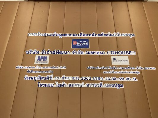 “ธุรกิจของ DHOUSE มีศักยภาพการเติบโตในอนาคต เนื่องจากกลุ่มผู้บริหารมีความเชี่ยวชาญในการดำเนินธุรกิจ เป็นหนึ่งในผู้นำอสังหาริมทรัพย์ในจังหวัดมหาสารคามมีประสบการณ์ในการพัฒนาอสังหาฯ เป็นอย่างดี รวมถึงเข้าใจพฤติกรรมและความต้องการของลูกค้า จึงมีความสามารถในการทำกำไรที่ดี การเดินทางไปโรดโชว์จึงเป็นการนำเสนอข้อมูลให้นักลงทุนได้เข้าใจธุรกิจของบริษัทมากยิ่งขึ้น” นายสมภพกล่าว